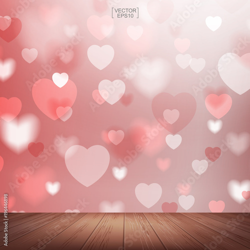 Wooden Table Top And Heart Blurred Background Used For Greeting Card